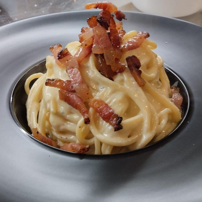 Troccoli, egg yolk, pecorino cheese, parmesan and bacon