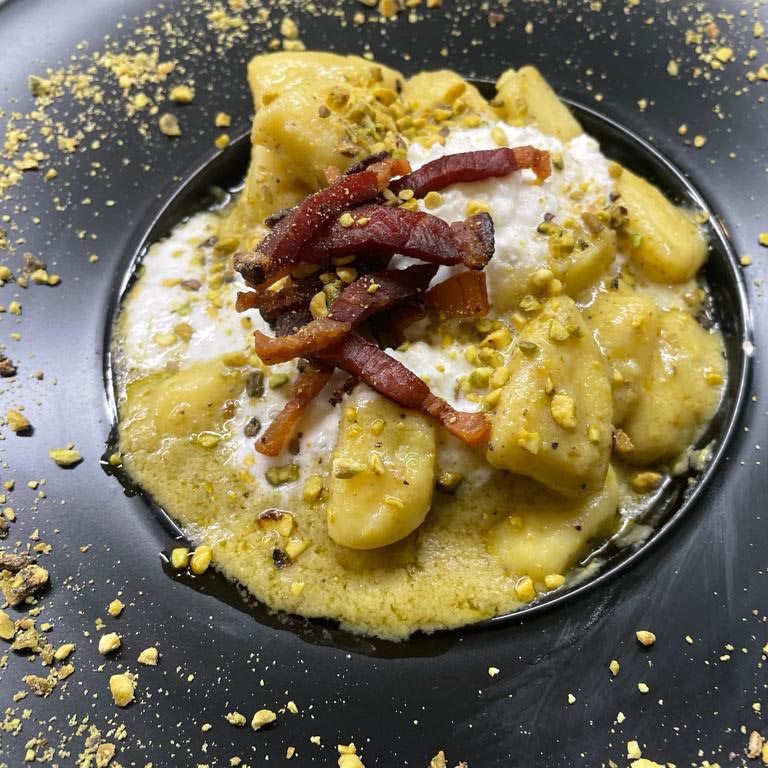 Gnocchi con salsa e granella di pistacchio, speck croccante e stracciatella